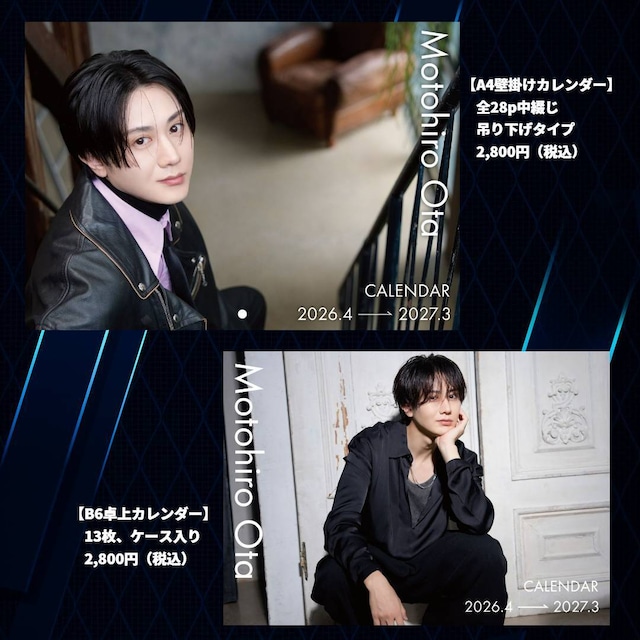 「太田基裕、2026.4-2027.3 カレンダー」発売決定! サイズは壁掛け(A4中綴じ)と卓上(B6)の2種類をご用意しました。 2026年4月からも、太田基裕カレンダーを是非お手元に♪ 【A4壁掛けカレンダー】 全28ページ中綴じ吊り下げタイプ 価格:2800円(税込) 【特典】オフィシャルショップ限定ブロマイド1枚 (壁掛け、卓上のブロマイドの絵柄は異なります) ※A4壁掛けサイズとB6卓上サイズのカレンダーデザイン(写真)は異なります。 ※「備考欄」へご記入されたものには対応できない場合がございます。発送時のご要望やお問い合わせは「CONTACT」の問い合わせフォーム( https://thebase.com/inquiry/otamotohiro )からお知らせください。( [email protected] からの返信となります) ※商品は4月上旬から順次発送予定です。 ※発送は日本国内のみとさせていただきます。